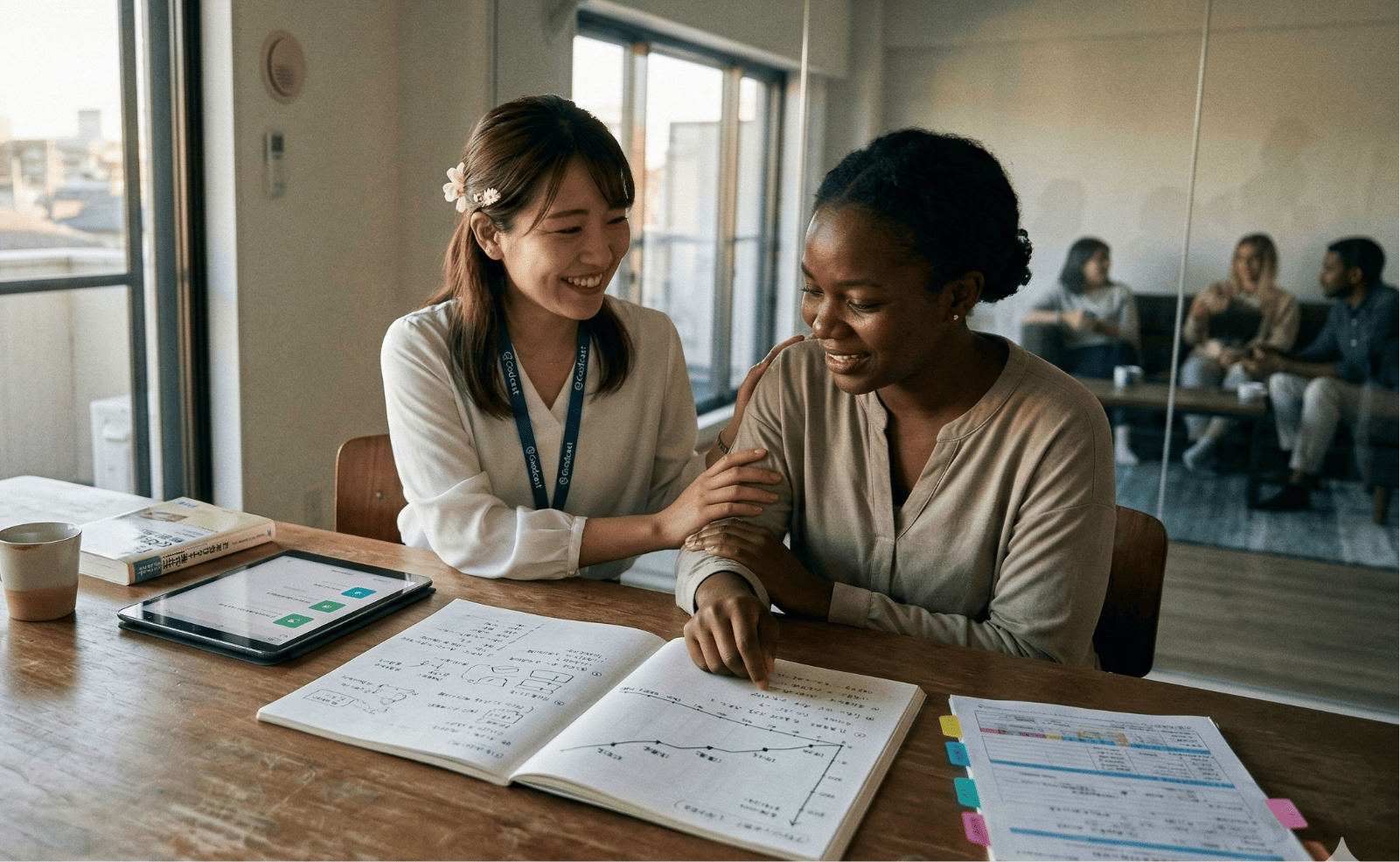 日本語教育(アプリ支援)、マナー・文化研修、ビザ更新手続き、寮管理など、就業後の生活・労務面まで“辞めさせない仕組み”を構築。