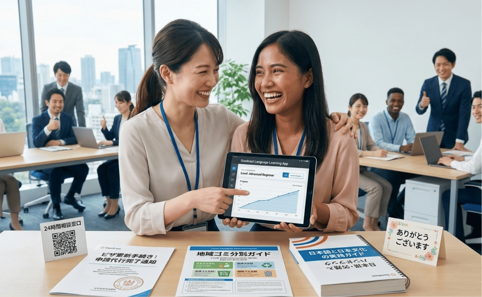 グッドキャストは、採用して終わりではなく、介護現場に定着し長く活躍してもらうことを最も重視しています。就業前の日本語・介護教育から、就業後の生活・就労・日本語フォローまで一貫して支援。現場職員と外国人材の双方に寄り添い、安心して働き続けられる環境づくりを行っています。